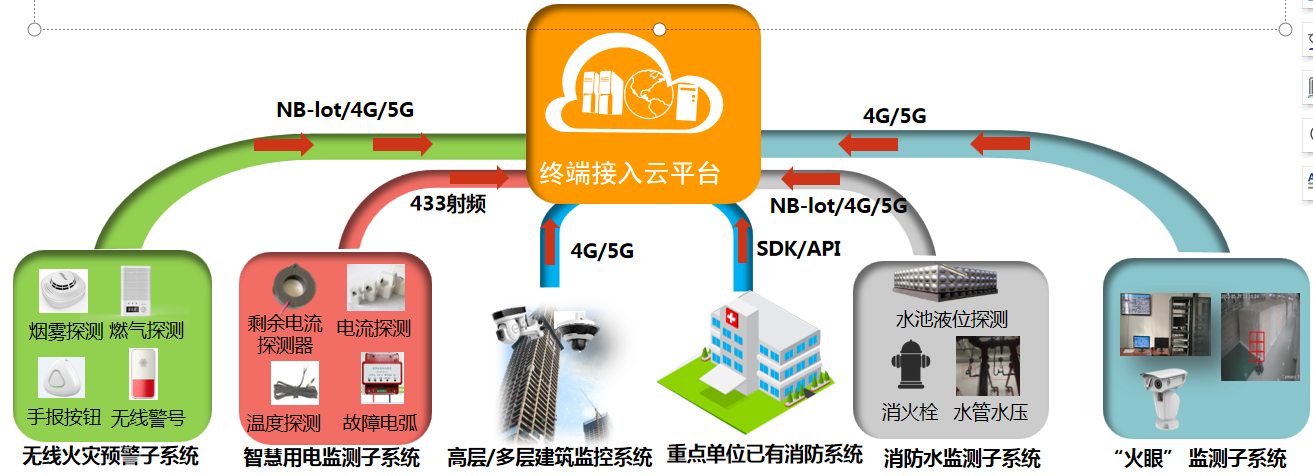 物聯(lián)網(wǎng)接入云平臺兼容多種接入方式,包括:433射頻/NB-lot/4G/5G技術(shù),無縫對接“無線火災(zāi)預(yù)警子系統(tǒng)”、“智慧用電監(jiān)測子系統(tǒng)”、“消防水監(jiān)測子系統(tǒng)”、“火眼監(jiān)測子系統(tǒng)” ,另外平臺還具備將原有重點(diǎn)單位的消防系統(tǒng)接入的能力,新增加對高層/多層建筑實(shí)行重點(diǎn)監(jiān)控。